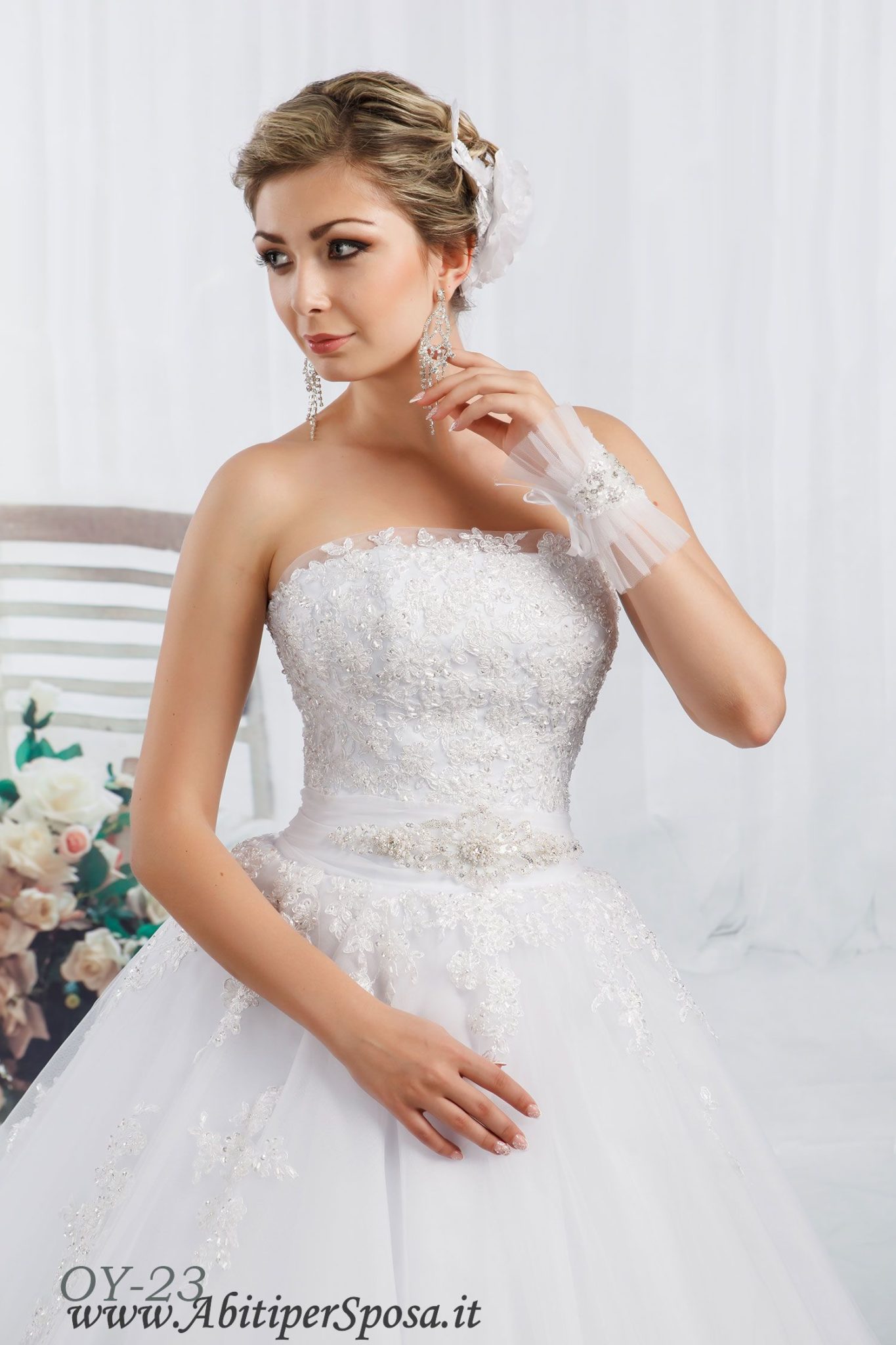 Abito da sposa ampio con corpetto in pizzo rebrodè arricchito da cristalli, in vita cintura decorativa con elementi gioiello.
