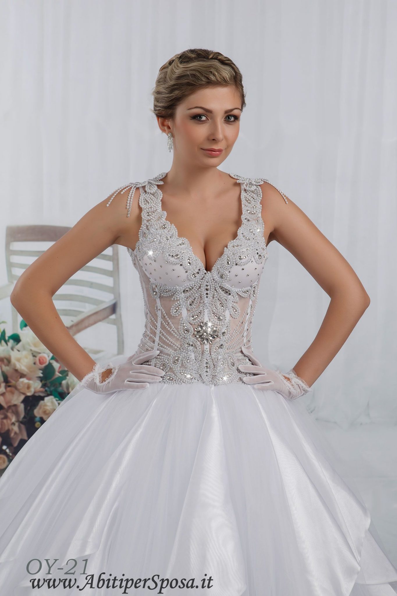 Abito da sposa linea Luxury con perline e strass sul corpetto.