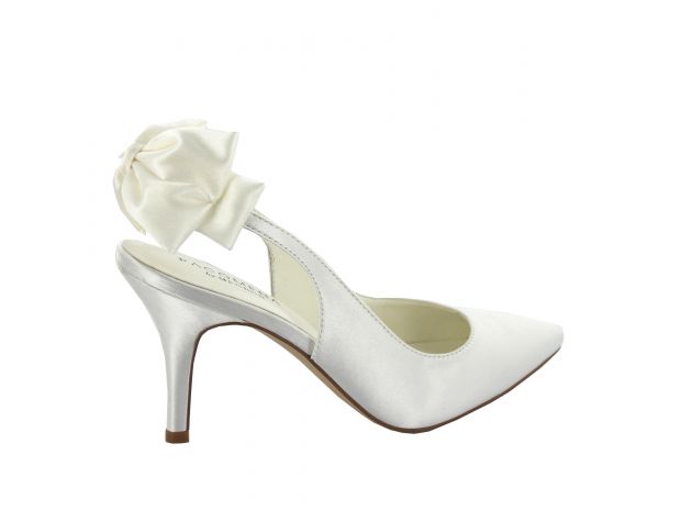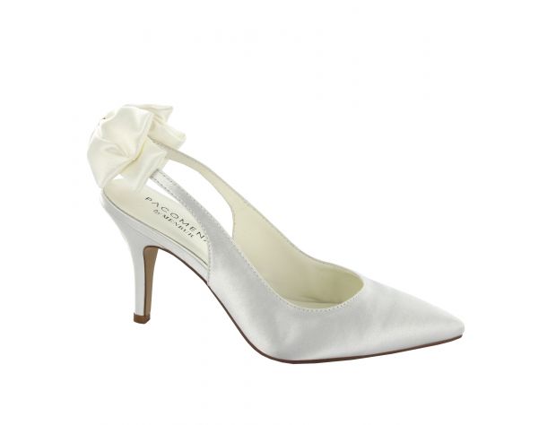 Elegantissime scarpe sposa chiuse con tallone scoperto. Colore bianco. Altezza tacco 8,5 cm.